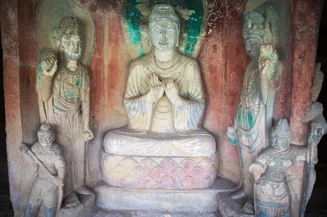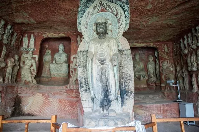 千佛崖摩崖造像始于北魏時期,歷經(jīng)了近1500年,在高45米,南北長200多米的峭壁上,布滿了造像龕窟,重重疊疊13層,密如蜂房。現(xiàn)存龕窟400多個及大小造像7000余軀。全崖造像以大云洞為中心,分南北兩段。南段龕窟有:大佛洞、蓮花洞、牟尼閣、千佛洞、睡佛龕、多寶佛龕、接引佛龕、供養(yǎng)人龕、神龍大佛、如意輪觀音、單身佛窟等;北段龕窟有:三世佛龕、無憂花樹窟、彌勒佛龕、三身佛龕、節(jié)行僧龕、菩提像窟、伎樂天人窟、地藏王龕、力士龕、盧舍那佛龕、十一面觀音像、阿彌陀佛龕、飛天窟、清代藏佛洞等。