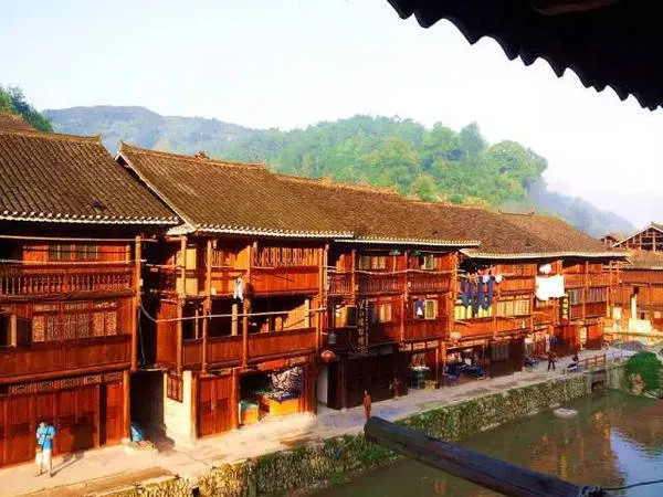 肇興侗寨四面環(huán)山,寨子建于山中盆地中的一處狹長地帶,一條小河穿寨而過。寨中房屋為干欄式吊腳樓,鱗次櫛比,錯落有致,全部用杉木建造,頂覆小青瓦,古樸實用。