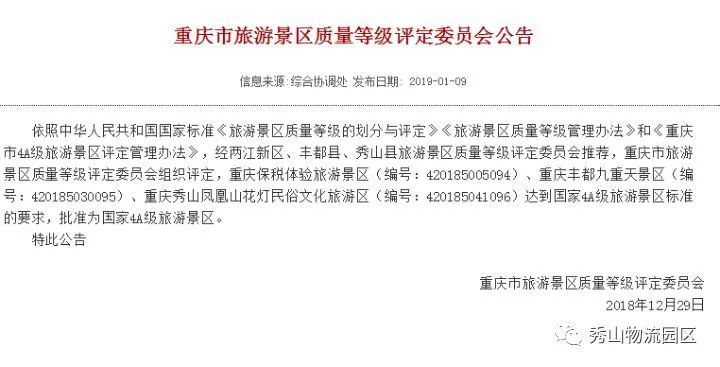 2019年1月9日,重慶市旅游景區(qū)質量等級評定委員會發(fā)布公告,依照中華人民共和國國家標準《旅游景區(qū)質量等級的劃分與評定》和《旅游景區(qū)質量等級管理辦法》,經(jīng)秀山縣旅游景區(qū)質量等級評定委員會推薦,重慶市旅游景區(qū)質量等級評定委員會組織評定,重慶秀山鳳凰山花燈民俗文化旅游區(qū)達到國家4A級旅游景區(qū)標準的要求,于2018年12月29日,批準為國家4A級旅游景區(qū)。