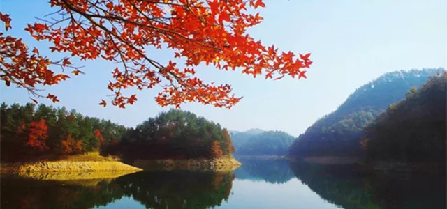 8:金山灣:全島以楓樹為主要植被,滿山遍島金色燦爛,故取名為“金山灣”,金山灣三面環(huán)山一面對(duì)湖,寧靜致遠(yuǎn),周遭群山環(huán)繞,綠意盎然。