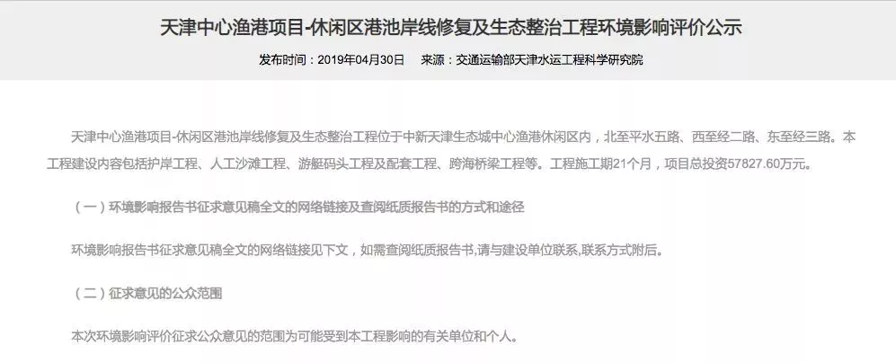 日前,中新生態(tài)城發(fā)布《天津中心漁港項(xiàng)目-休閑區(qū)港池岸線修復(fù)及生態(tài)整治工程環(huán)境影響評(píng)價(jià)公示》(以下簡(jiǎn)稱《環(huán)境影響評(píng)價(jià)》),《環(huán)境影響評(píng)價(jià)》中表示:天津中心漁港項(xiàng)目-休閑區(qū)港池岸線修復(fù)及生態(tài)整治工程位于中新天津生態(tài)城中心漁港休閑區(qū)內(nèi),北至平水五路、西至經(jīng)二路、東至經(jīng)三路。本工程建設(shè)內(nèi)容包括護(hù)岸工程、人工沙灘工程、游艇碼頭工程及配套工程、跨海橋梁工程等。工程施工期21個(gè)月,項(xiàng)目總投資57827.60萬元。