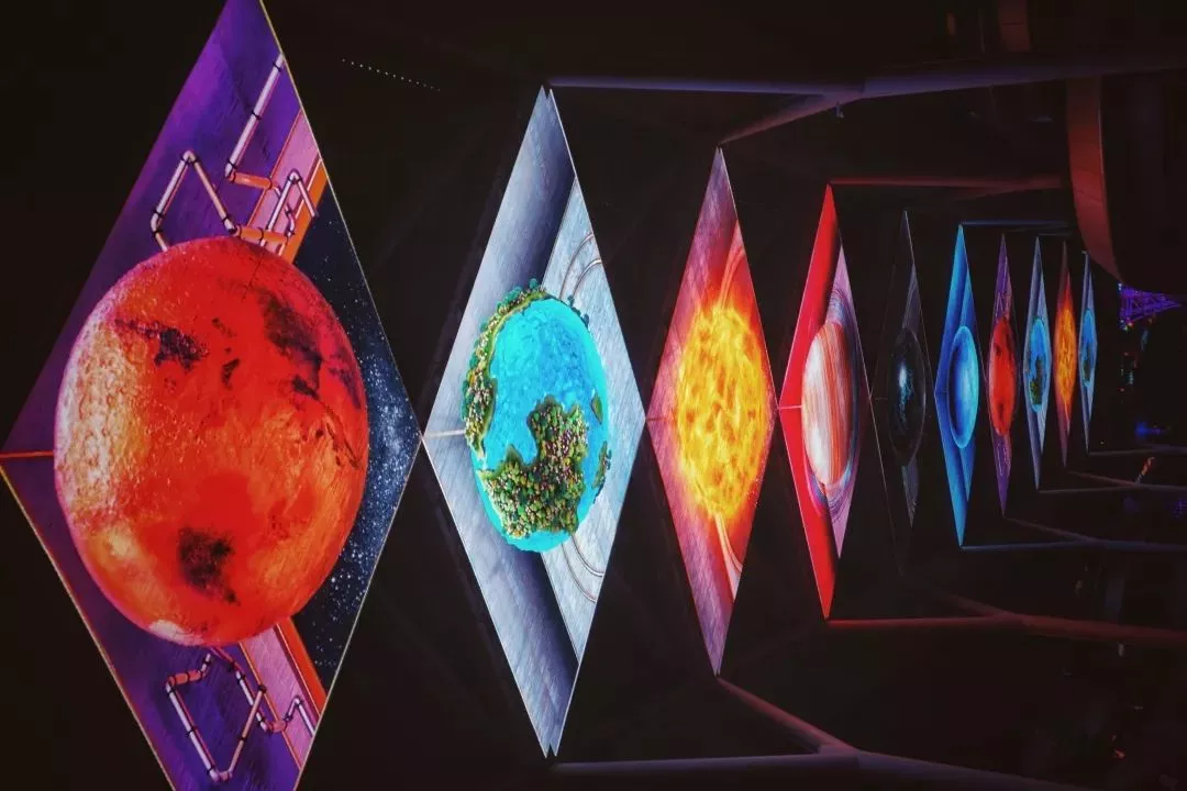 還有模擬真實(shí)的宇宙空間,展示壯麗太陽(yáng)系多星體的宏大景象。八大行星根據(jù)距離太陽(yáng)的遠(yuǎn)近,進(jìn)行布置。行走其間如同穿行于宇宙的小天體,漫步太陽(yáng)系其中。