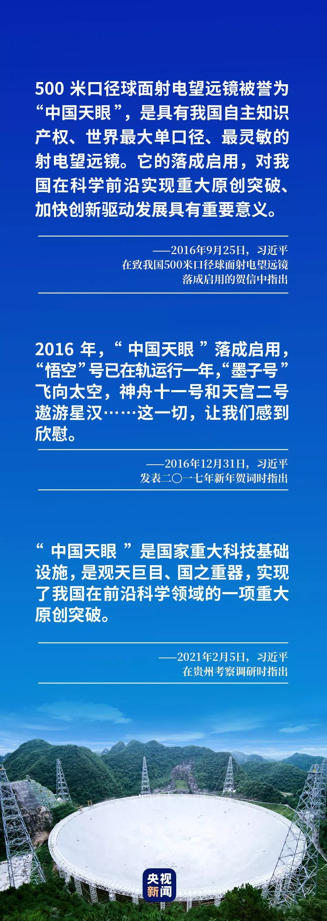自落成啟用以來(lái),習(xí)近平總書(shū)記多次強(qiáng)調(diào)“中國(guó)天眼”的重要意義——