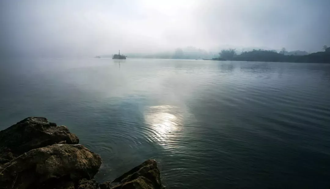 朦朧的遠山,籠罩著一層輕紗,影影綽綽,在飄渺的云煙中忽遠忽近,若即若離,河面綠得像一條翡翠色的綢帶,波光粼粼,構(gòu)成一幅雅致的淡墨山水畫。