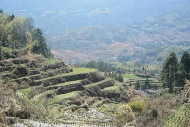 庵基嶺古道所在維新社區(qū),地屬山區(qū),群山連綿,逶迤起伏,座座山梁,梯田層層,依山旁溝,經(jīng)山不絕。順著石塊鋪成的山間小路,邊走邊俯視四周的梯田,你不能不感嘆這里世世代代人民的勤勞與智慧,以及大自然給人類的恩賜。