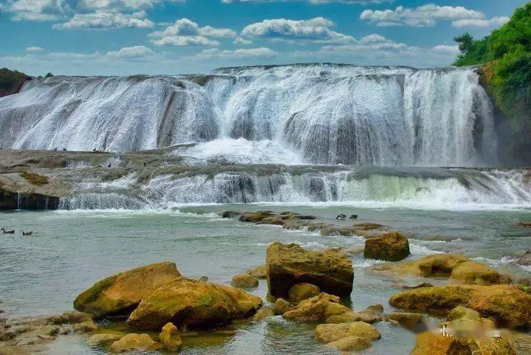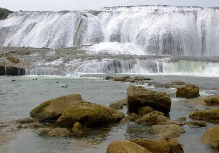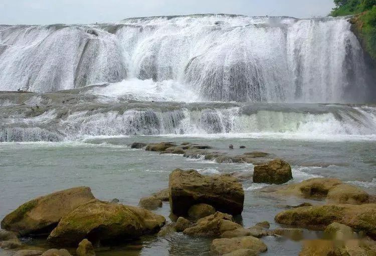 位于黃果樹瀑布上游1公里處,瀑頂寬105米,高21米,是黃果樹瀑布群中瀑頂最寬的瀑布。陡坡塘瀑布頂上是一個(gè)面積達(dá)1.5萬平方的巨大溶潭,瀑布則是形成在逶迤100多米長的鈣化灘壩上。陡坡塘瀑布還有一個(gè)特殊的現(xiàn)象:每當(dāng)洪水到來之前,瀑布都要發(fā)出“轟隆.轟隆”的吼聲,因此又叫“吼瀑”。