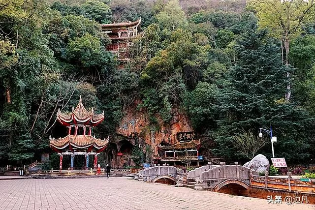 其地三山環(huán) 抱,一水中流,古木參天,濃蔭匝地,雅靜清幽。山、水、樹、洞相映成趣,亭、臺(tái)、樓、閣相得益彰。