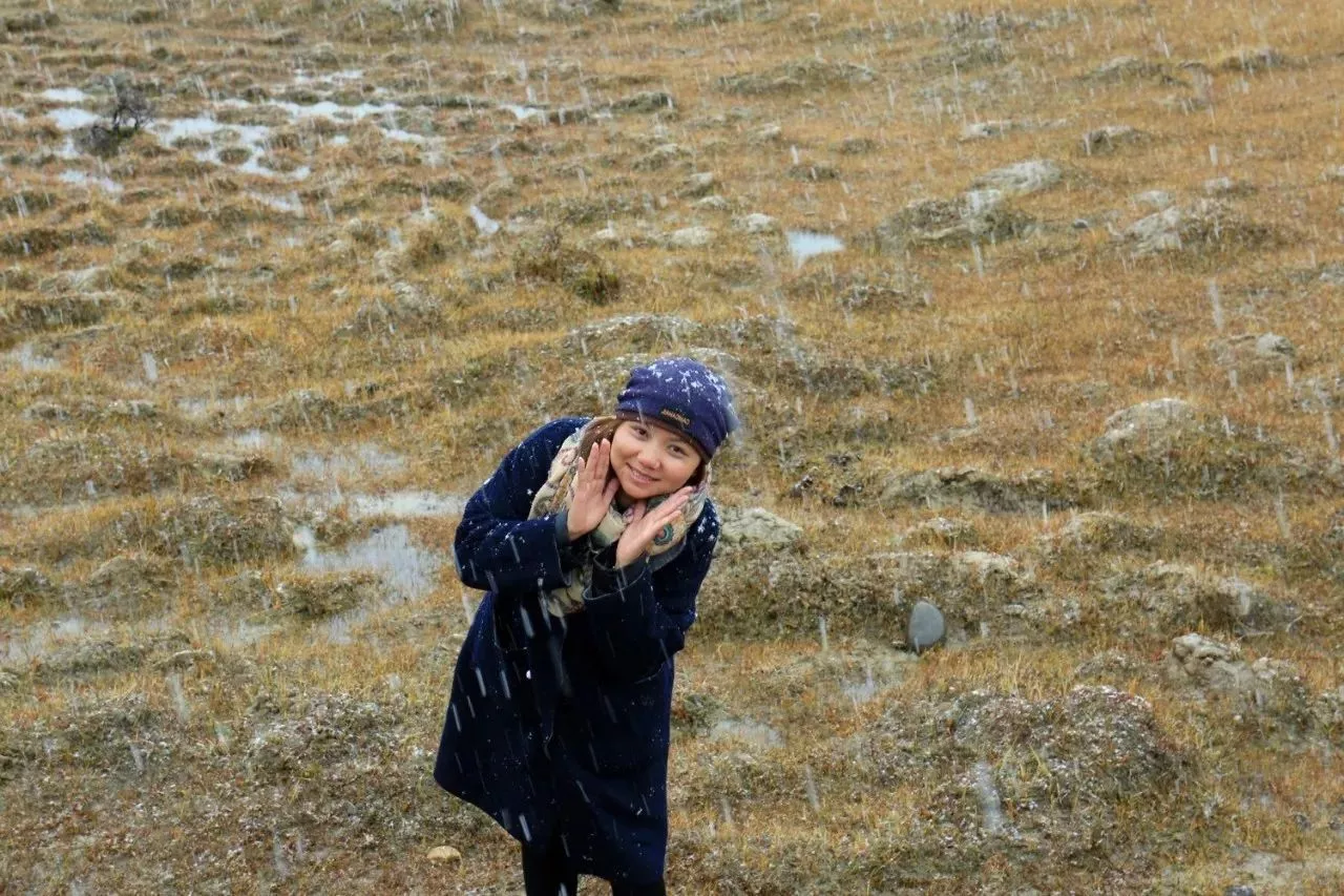 當(dāng)我們沿著然烏湖,頭頂風(fēng)雪來(lái)到冰川前發(fā)現(xiàn),需要爬過(guò)一片亂石堆。沒(méi)有猶豫,堅(jiān)定的四肢并用的攀爬起來(lái)。在風(fēng)雪中,海拔4000余米,三十多分鐘的爬行,終于走進(jìn)這淡藍(lán)色的世界。
