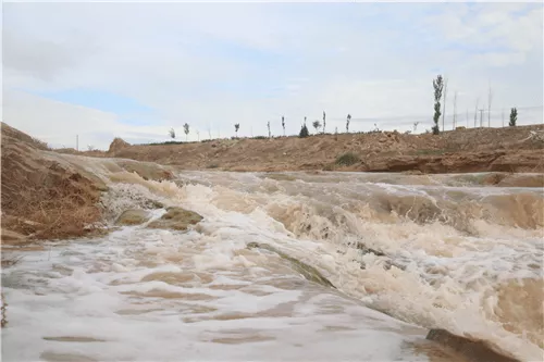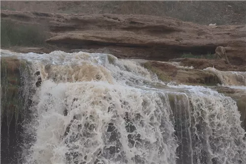 橫跨衛(wèi)寧公路的山河橋,河水自上而下,途經(jīng)石洞流速猛增,自隧洞的另一端噴射而出,砸向低處的河道,濁浪激蕩,形成寬數(shù)丈的瀑布,氣勢如同微縮的黃河壺口瀑布,是如今觀賞清水河改道遺跡的絕佳之處,也被當?shù)厝朔Q“中寧小壺口瀑布”。