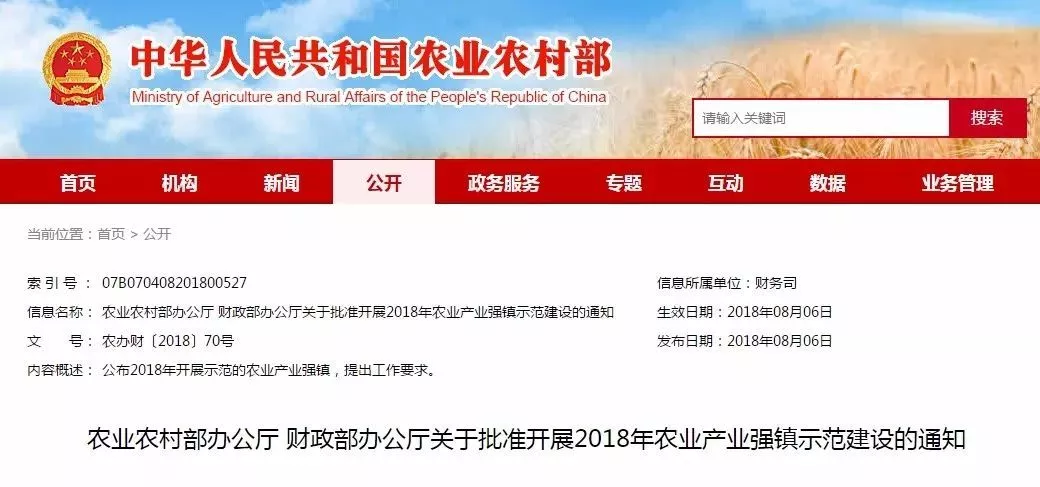 關于批準開展2018年農(nóng)業(yè)產(chǎn)業(yè)強鎮(zhèn)示范建設的通知