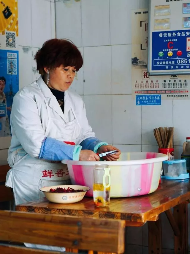 和砂鍋粉同一排門面最尾部這家黑山羊羊肉粉才是我最情懷的一家,我印象中第一次吃羊肉粉就是在這里,18年的歷史,也就是我5歲就開始吃的羊肉粉,不管我已經走了這么多地方我還是最喜歡她家,去的時候老板在剪辣椒,她家酸菜、香辣脆、泡菜都是自己做。