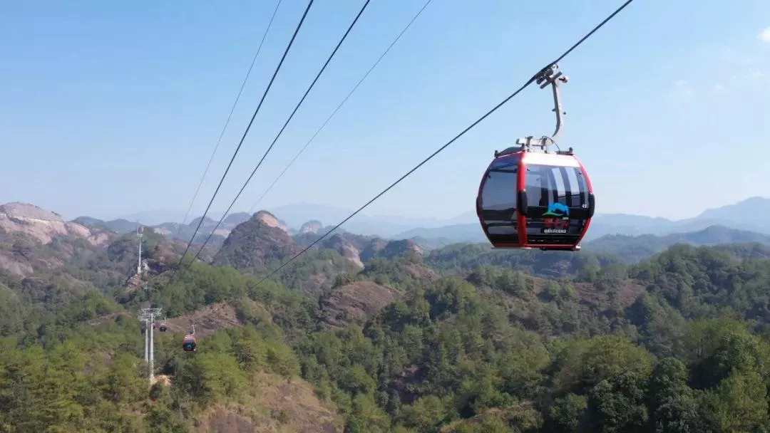 索道全長2300米,線路高差23米,設(shè)計時速每秒5米,每小時運送客人1500人,索道還配備720度無死角全景全透明玻璃轎廂!