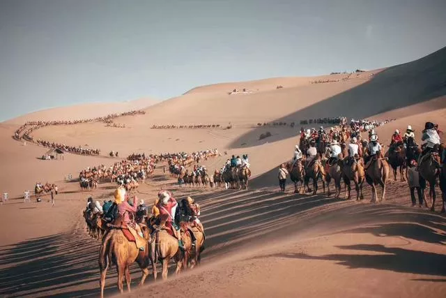 鳴沙山月牙泉是一體的,這一帶全是沙漠,沙丘堆成山狀,連綿不絕,之所以名為鳴沙山,是因?yàn)轱L(fēng)吹震動(dòng)導(dǎo)致沙漠中的沙粒移動(dòng),發(fā)出了嗡嗡的聲響,如一曲沙漠音樂(lè)。據(jù)記載,鳴沙山已經(jīng)存在3000多年了,如今可謂是人山人海。