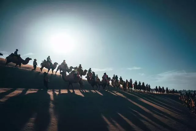 本來(lái),鳴沙山的風(fēng)光會(huì)給人帶來(lái)一種孤獨(dú)感,可走在其中,看著游客們騎著駱駝,反而消蝕了這份荒涼的孤寂,帶來(lái)了熱鬧,甚至,當(dāng)你看到駱駝隊(duì)伍整齊行走的畫(huà)面,竟然有回到過(guò)去繁華商路時(shí)代的錯(cuò)覺(jué)。當(dāng)真是,人少有人少的味道,人多有人多的氣魄。
