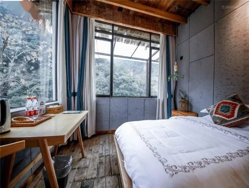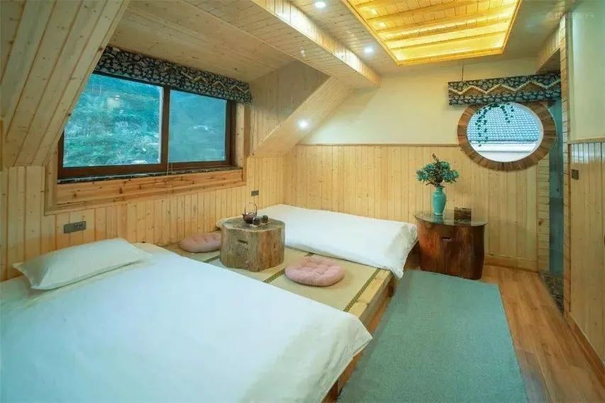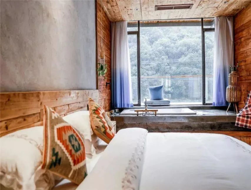 轉(zhuǎn)到房間內(nèi),是清新的木質(zhì)感,透過窗戶,是山水浸潤,退回室內(nèi),是舒爽和便利,還有小小天窗,伸出手,在這個人間仙境,似乎距離星空又近了一些……