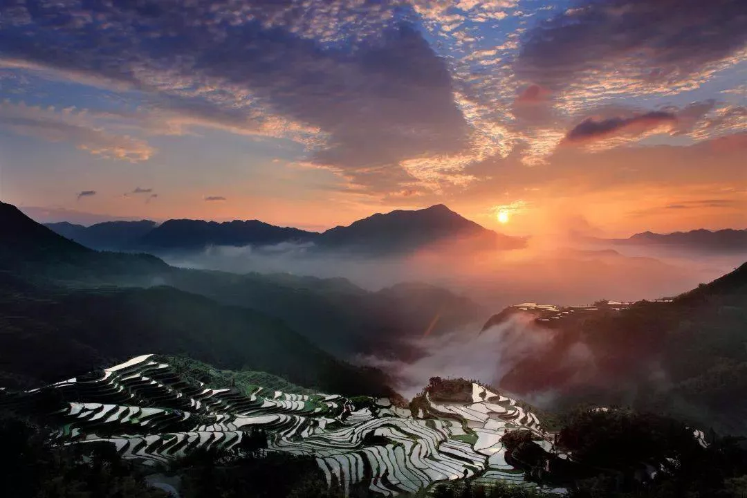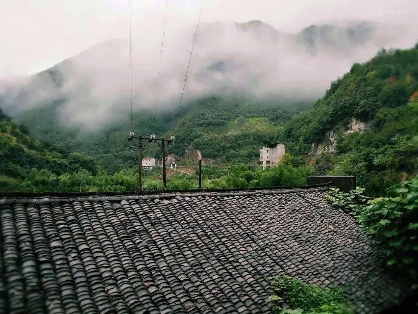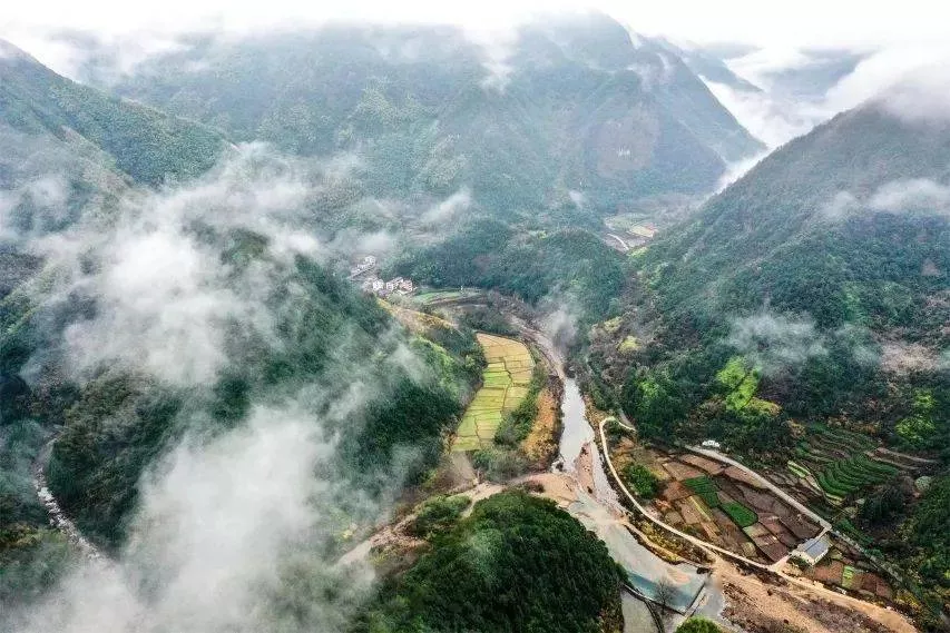 沿著崎嶇蜿蜒的山路,只要追著云海流動的方向,就能抵達這里,考坑古村被群山簇擁著,在山頭回看,它就坐落在山底中央