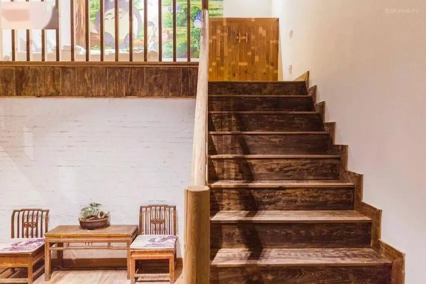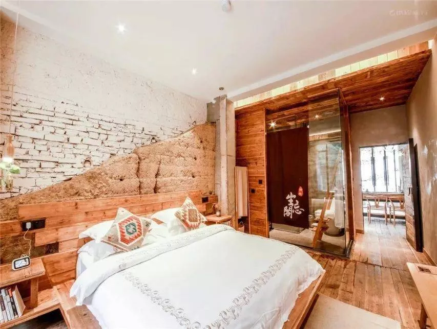 在藏書閣隔壁的一棟單獨的建筑,是民宿部分,三層建筑,房間墻面風格順延了整個建筑的風格,做成了土墻青磚。