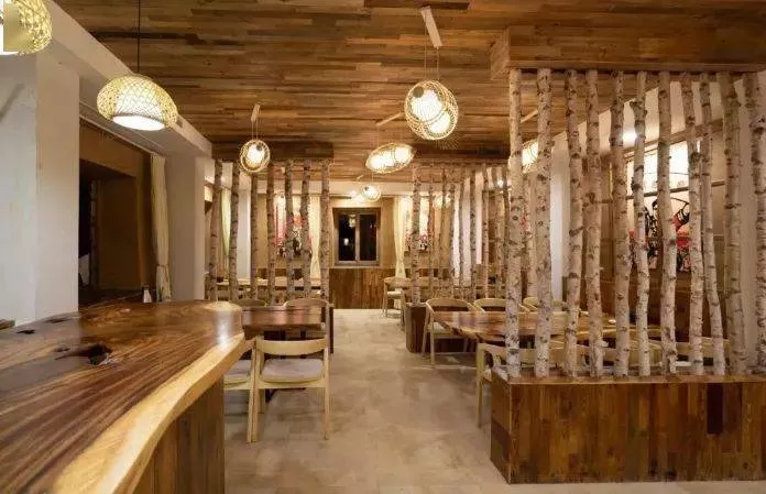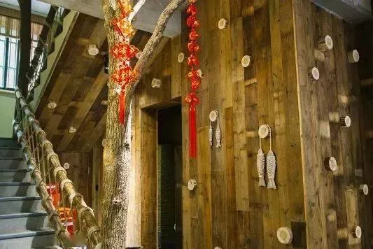 仿古老木料的裝飾,透露著歲月和自然的氣息,撫摸過去,起伏的好像是林木,又好像是隱藏在山村中磅礴的生命力。