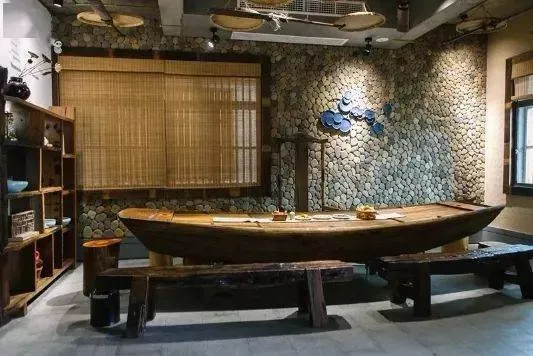 整個民宿都以打漁人家為主題,大廳里,喝茶的長桌是一艘小漁船,船身蓋上木板,就成了喝茶的桌子。大廳里還裝飾著船槳、蝦簍、竹子做的帽子,墻上掛了木制的小魚,讓人感受到打漁人家的生活。