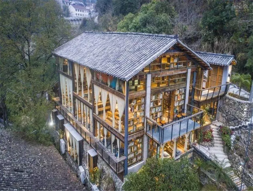 “坐忘閣”分兩部分,一部分是藏書閣,一部分是民宿。藏書閣依山而建,保留一部分山體種植青苔,冬暖夏涼,古木和書香、蟬鳴與琴聲,在書閣悠悠回蕩,如果你愛讀書,那你一定不能錯過這里。