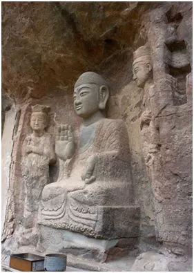 第 4 窟,北周開鑿。位于云崖寺窟區(qū)西部,第 3龕東側,二龕相距 1.35 米,佛龕距崖邊 3.5 米。摩崖敞口淺龕,平面半月形。龕高 3.65、寬 3.8、進深 1.03 米。龕底距崖面平臺 0.6 米。龕內(nèi)高浮雕石胎泥塑一佛二菩薩三尊像。中間主尊佛高 2.53 米,胸部以上至頭部為現(xiàn)代補修。雙肩較圓,外披低垂圓領袈裟,領垂至腹部,露出內(nèi)斜披僧祗支,僧祗支上系帶,衣紋呈陰刻階梯狀。右手殘,現(xiàn)代補修。左手亦經(jīng)現(xiàn)代補修,作降魔印。結跏趺坐,右足押于左股上,露足,衣裾從腳腕處分成人字形向左右散開,分兩層,邊緣折疊。坐于方形佛座上,座高 0.75、寬 1.68、進深 0.87 米。左右脅侍菩薩身體略側。左側菩薩高 2.8 米。頭戴蓮瓣寶冠,寶繒下垂于肩頭兩側。面形方圓,頸粗短,雙肩略圓,頸戴尖形寬項圈,肩頭有圓形飾物,下垂長帶,右臂向左曲于腹部,手握蓮蕾。左臂于體側下垂,手握圓環(huán)形飾物,飾物上垂下絲帶打結,披帛于正面膝下部兩側交叉,再上提至肘彎處下垂,立于方形臺上。右脅侍菩薩高 2.8 米,與左菩薩同,左右對稱。龕外兩側上下各有數(shù)個木樁孔,原應有木構建筑,已不存。