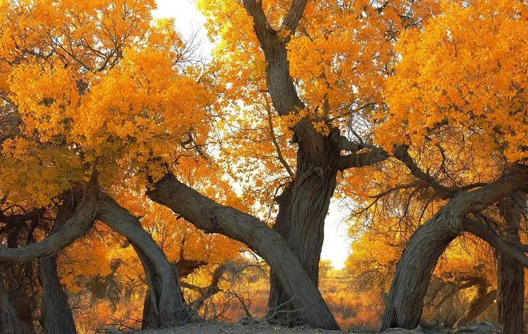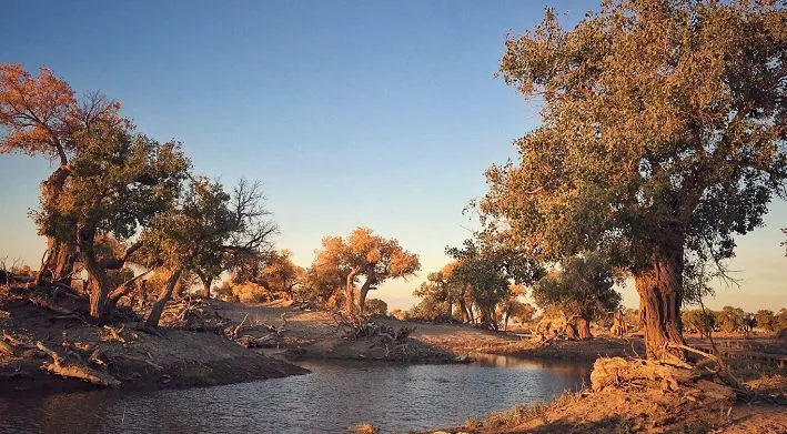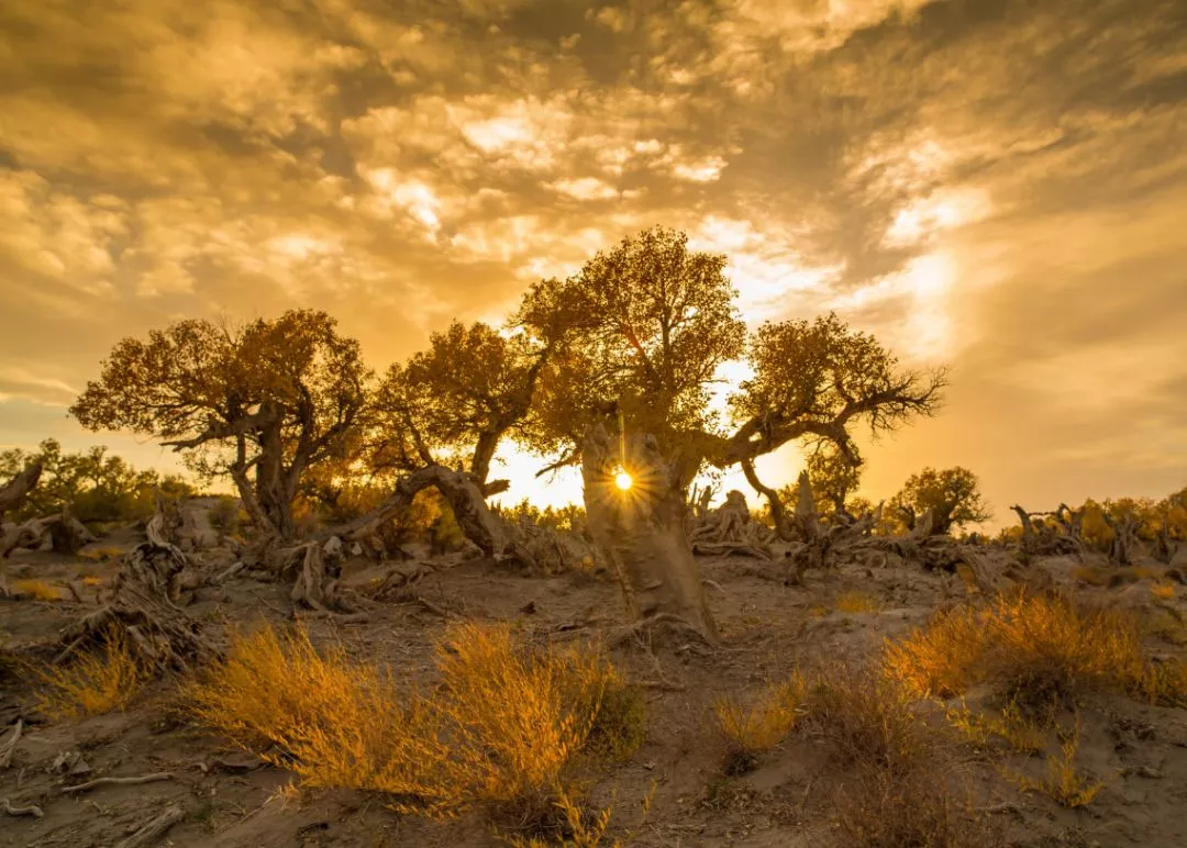 在荒漠和沙地上,胡楊是唯一能天然成林的樹種。胡楊已經(jīng)有300萬到600萬年的歷史。胡楊根系可長至長達(dá)15米,向四周蔓延,為了在極端干旱的環(huán)境里吸收到水分,它可深入到地下13米左右。胡楊耐高溫又耐寒,可在正負(fù)39℃的氣溫條件下生存;耐干旱,可在降水50毫米以下條件生長;耐鹽堿,抗風(fēng)沙,可抵御每秒26米的大風(fēng),是天然的綠洲,是亞洲荒漠平原丘陵中分布最廣的喬木樹種之一。
