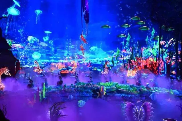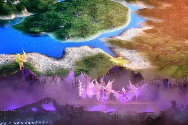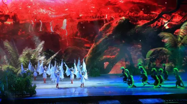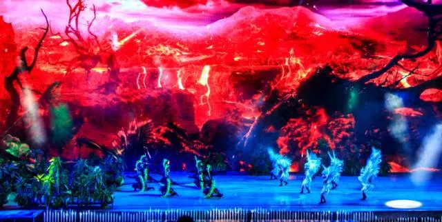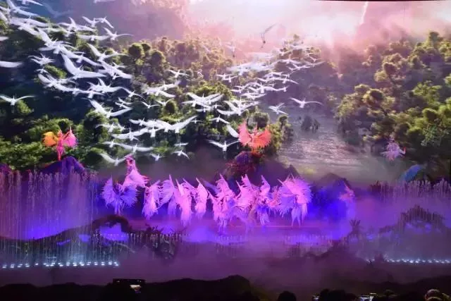 首先吸引眼球的是大.小恐龍的表演.而雨林冰川的變化喻意滄桑巨變,栩栩如生的機械白鷺展翅9米迎面飛來喻意鷺鳥的形成