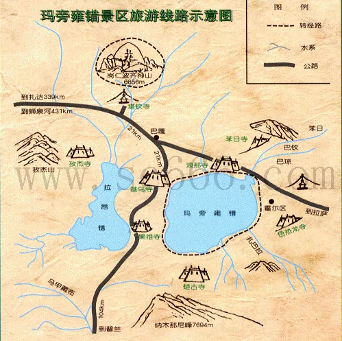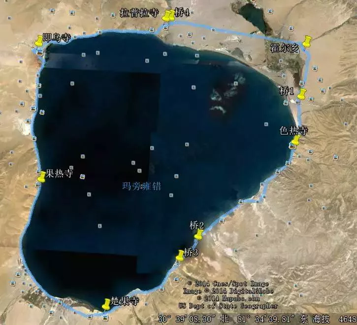 早上從霍爾鄉(xiāng)(GPS坐標N30°46.3506′ E81°36.5285′)出發(fā),不要徑直往湖岸邊走,遠處的湖泊并不是圣湖的湖水,而是一片沼澤地。先沿著大道往前行進,快出霍爾鄉(xiāng)的時候向右拐去,轉(zhuǎn)湖的小道就出現(xiàn)在你的前面,此地離湖還有兩公里左右的距離。之后沿著在轉(zhuǎn)湖小路,大約2~3個小時,過了一座小橋來到湖岸邊的寺廟腳下,這就是色熱寺(GPS坐標N 30°41.5297′ E81°36. 3160′)。色熱寺始建于1668年,據(jù)稱當年阿底峽尊者轉(zhuǎn)圣湖時曾在該寺駐錫,是圣湖八大寺之一。不過,寺廟曾被嚴重破壞,現(xiàn)在所見到的寺廟是最近幾年在原址上重新修建的。寺廟附近有一兩處喝茶休憩的地方,也有藏民家可以借宿,不過大多數(shù)藏民只會說藏語,溝通起來比較困難。