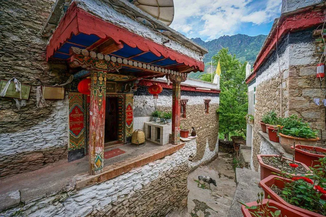 “甲居”,藏語是百戶人家之意。藏寨從大金河谷層層向上攀緣,在相對高差近千米的山坡上,一幢幢藏式樓房灑落在綠樹叢中。