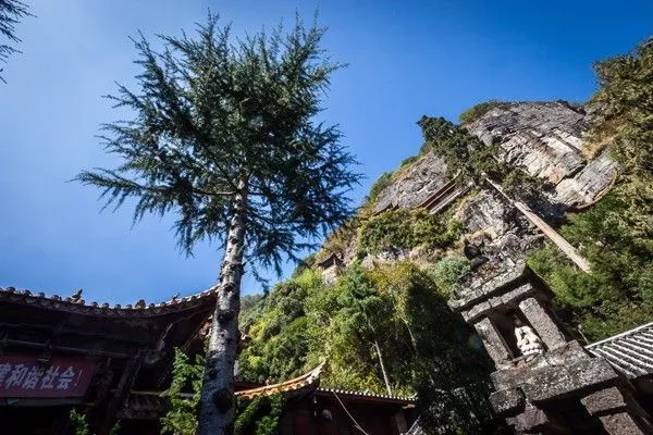 碧云坊之后便是賢林禪寺飛檐出閣的山寺門樓和大雄寶殿。寺后依山附崖凌空而建,虛懸半空的亭臺樓閣,為滿賢林最雄奇壯觀的古建筑群,就是《康熙劍川州志》中曾記載的“滿賢林……中有古剎,香客僧房,構于懸崖之上”的“懸空寺”。
