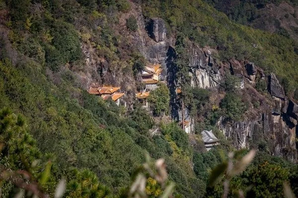 始建于元末明初,是劍川道教(正一道)的主要活動場所。金華古寺有兩重門,一門為三間重檐歇山頂建筑,入門后右側有一徐霞客雕像,基座石壁上刻有邑人王博民書徐霞客游歷金華山的往事。二門為三開間單檐硬山頂建筑,明間出挑,殿內(nèi)檐下懸有多塊題匾。大殿飛檐出角,殿后兩崖壁邊建有玉皇閣三清閣、龍王廟、觀音殿、彌勒殿、望海樓、呂祖殿等建筑,星星點點,散布在“雙峰鎖合”的懸崖絕壁之間,犬牙交錯,殿宇飛峙,斗拱交疊,精雕騰龍翔鳳,施以重彩。疊翠中但見巍峨,清幽中含有莊嚴。當年徐霞客登臨金華古寺時寫道:“蟠龍附石,臥虎藏林,靈泉飛濺,茂林修竹,景仰之情,油然筆下?!?/p>