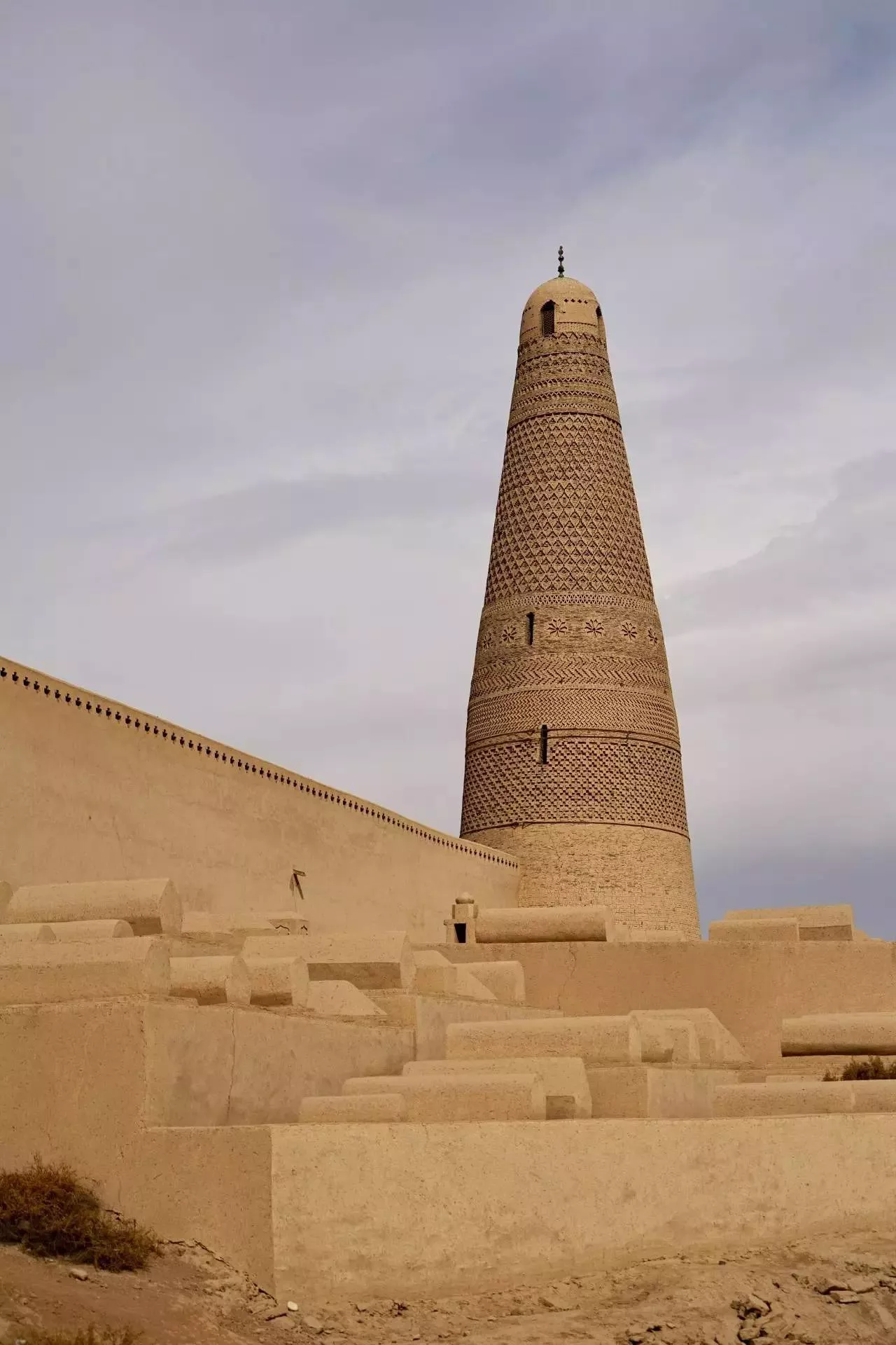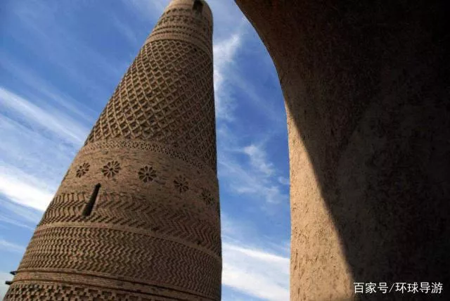 蘇公塔又稱吐魯番塔,位于吐魯番東南2公里處葡萄鄉(xiāng)木納格村的臺地上。建于清乾隆年間。是一座造型新穎別致的伊斯蘭教古塔,蘇公塔外部用清一色灰黃色磚砌成,除了頂部窗欞外,基本上沒有使用木料。塔身渾圓,呈圓柱體,自下而上逐漸收縮,塔基直徑10米,頂部直徑2.8米,塔高37米,四周共有14個窗口,供通風(fēng)采光用。塔內(nèi)用磚砌出的螺旋式中心柱,72級臺階直通塔頂,塔頂面積約10平方米,可供了望。塔頂為穹窿頂,上有鑄鐵塔飾。塔身表面砌疊十四種不同形狀的幾何圖案,或平置或斜砌或凹進(jìn)或凹陷,這些維吾爾族傳統(tǒng)圖案,是伊斯蘭教建筑風(fēng)格中寺院雕刻繪畫藝術(shù)的代表。