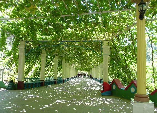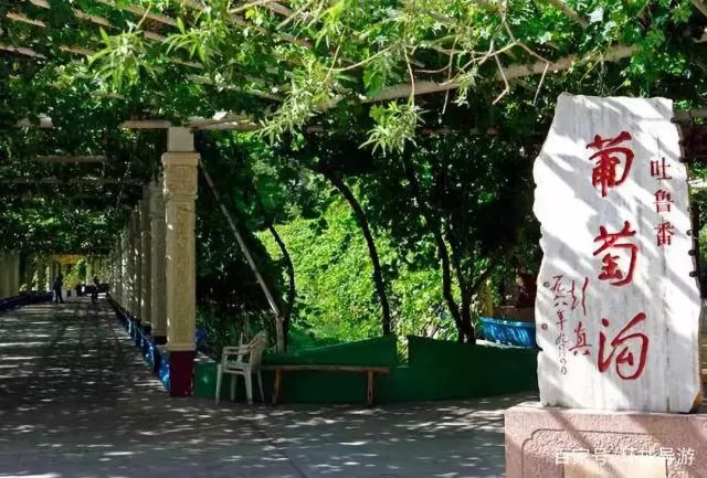 火洲聞名遐爾的“清涼世界”-----葡萄溝,位于吐魯番市東北13千米的火焰山峽谷中。該溝是一條不太深的切蝕溝,南北長8千米,東西寬約0.5千米,最寬處方可達(dá)2千米,一條小溪流貫其間,溝側(cè)沿隙中時有汩汩泉水滲出。溝中綠蔭蔽日,滿溝全是層層疊疊的葡萄架,花果樹木點(diǎn)綴其間,村舍農(nóng)家錯落有致,山坡高處還有許多空心土壘砌專門晾曬葡萄干的“晾房”。葡萄溝現(xiàn)有葡田400公頃,主要種植著名的無核白葡萄馬奶子、喀什哈爾、黑葡萄、比夾干、梭梭葡萄、紫葡萄等數(shù)十個葡萄品種。年產(chǎn)鮮葡萄600萬千克,葡萄干300多噸。