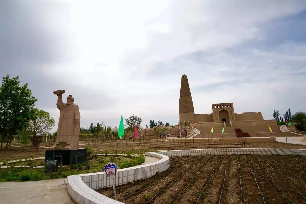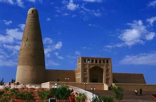 蘇公塔又稱額敏塔,位于吐魯番市東郊葡萄鄉(xiāng)木納爾村,是一座造型新穎別致的伊斯蘭教塔,也是新疆境內(nèi)現(xiàn)存最大的古塔,建于公元1778年,迄今已有240多年的歷史。它是清朝名將吐魯番郡王額敏和卓,為了恭報(bào)清王朝的恩遇,表達(dá)自己對真主的虔誠,自出白銀7000兩建造。整個建筑由蘇公塔和毗鄰的一座能容納1000人的清真寺組成,每年來這里參觀禮拜的人絡(luò)繹不絕。