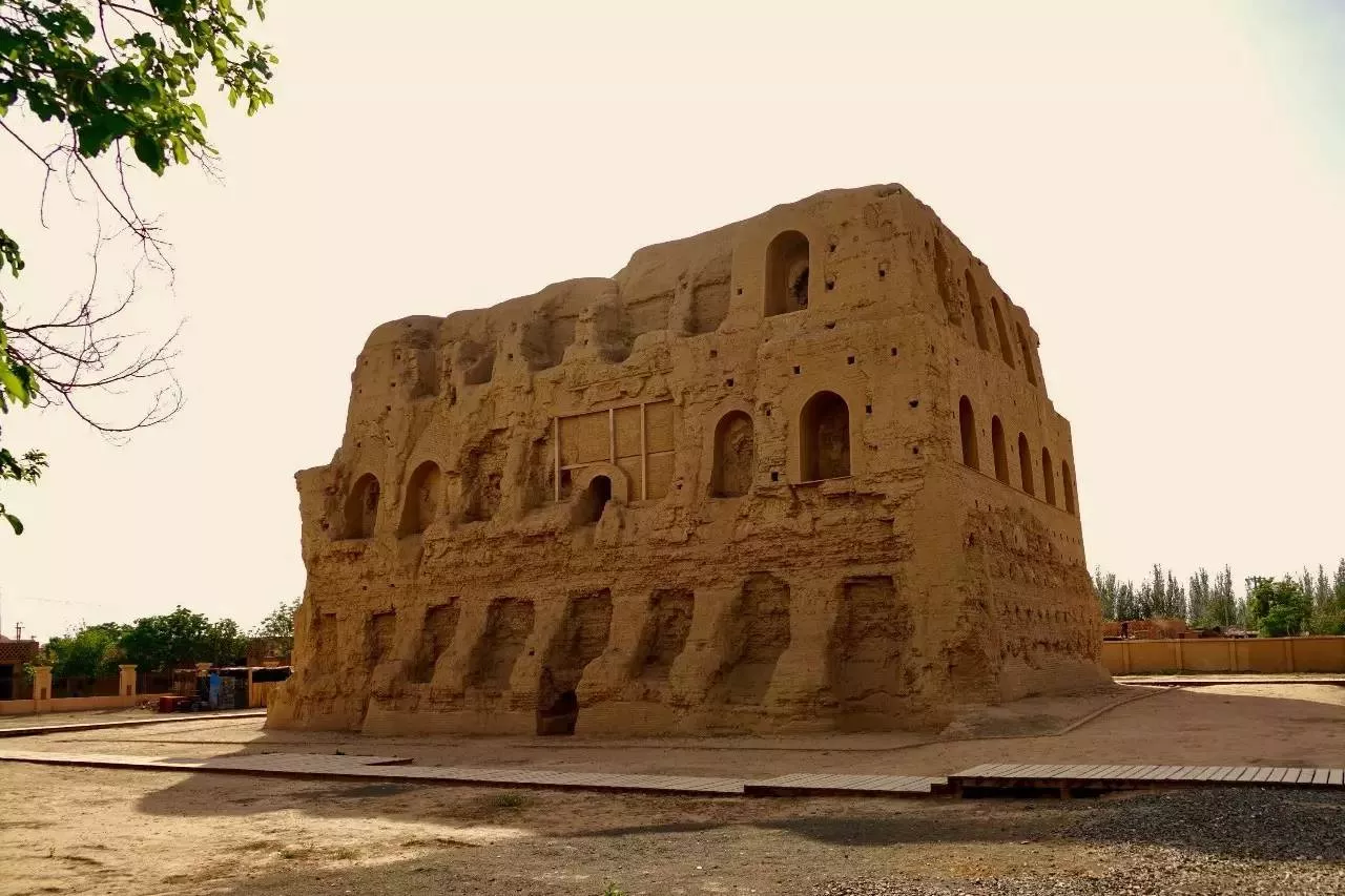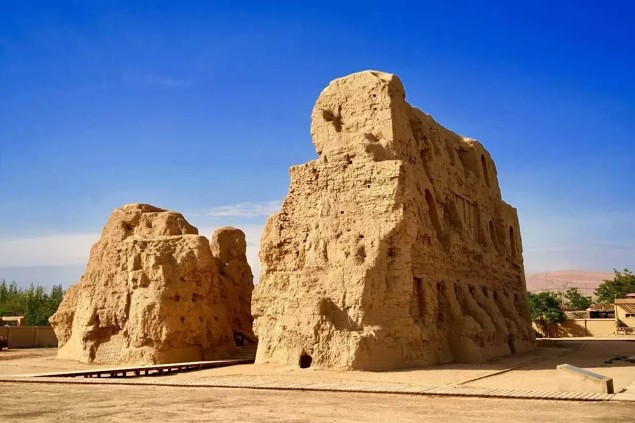 高昌故城位于吐魯番市東45公里處火焰山南麓木頭溝河三角洲。始建于公元前1世紀(jì)漢代,是世界宗教文化薈萃的寶地之一。高昌故城,維吾爾語中稱為“亦都護(hù)城”,即“王城”。《北史 高昌傳》中稱它因“地勢高敞,人庶昌盛”,而得名高昌。初為唐時高昌國都所在,后為西州回鶻都城,元末明初始廢,歷時一千四百余年。全城分外城、內(nèi)城、宮城三部份。周長5.4公里,呈長方形,外墻基寬12米,墻高11.5米,夯士筑成。全城有九個城門。高昌故城廢棄后。大部分建筑物消失無存,目前保留較好的有外城西南和東南角保存兩處寺院遺址,寺院內(nèi)有摩尼教壁畫和佛教壁畫、塑像等。城內(nèi)遺物還出土有不同文字的文書和經(jīng)典。內(nèi)城北部正中有一座不規(guī)則的方形小城堡,當(dāng)?shù)厝朔Q“可汗堡”。