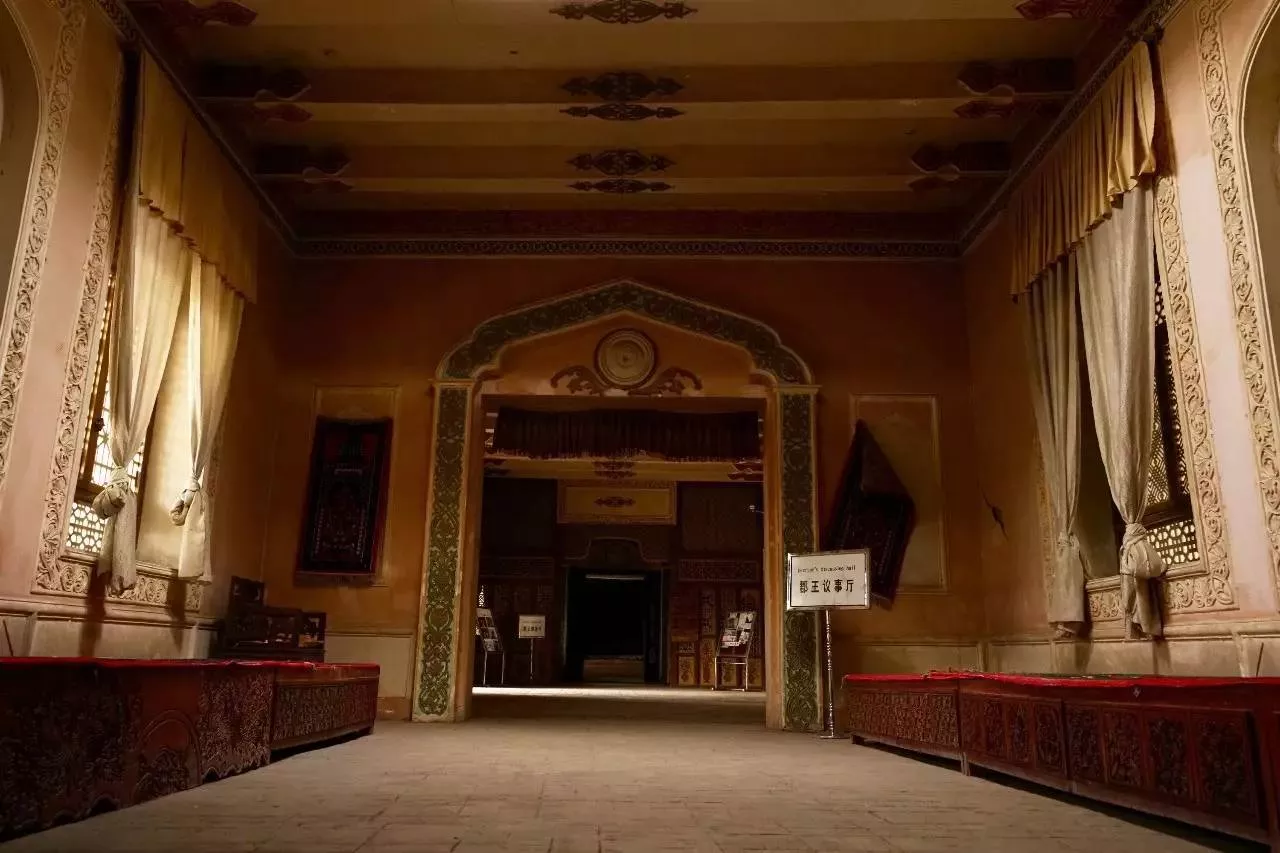 吐魯番郡王府,位于吐魯番東南2公里處葡萄鄉(xiāng)木納格村,緊鄰蘇公塔,據(jù)史科考證始建于清朝乾隆年間,是吐魯番郡王額敏和卓生活和主持政務(wù)、指揮軍事的地方,也是清王朝期間吐魯番維吾爾族的政治、經(jīng)濟(jì)、文化和軍事指揮的中心。其主人額敏和卓不僅是當(dāng)時吐魯番維吾爾族的領(lǐng)袖、清政府的參贊大臣,也是一位杰出的愛國者和軍事家。吐魯番郡王府在1933年被火燒毀?,F(xiàn)在的郡王府是根據(jù)史料記載基本按以前的維吾爾族建筑風(fēng)格、布局和規(guī)模恢復(fù)興建的?,F(xiàn)在的郡王府占地面積22畝,宮殿建筑面積約二千五百平方米。