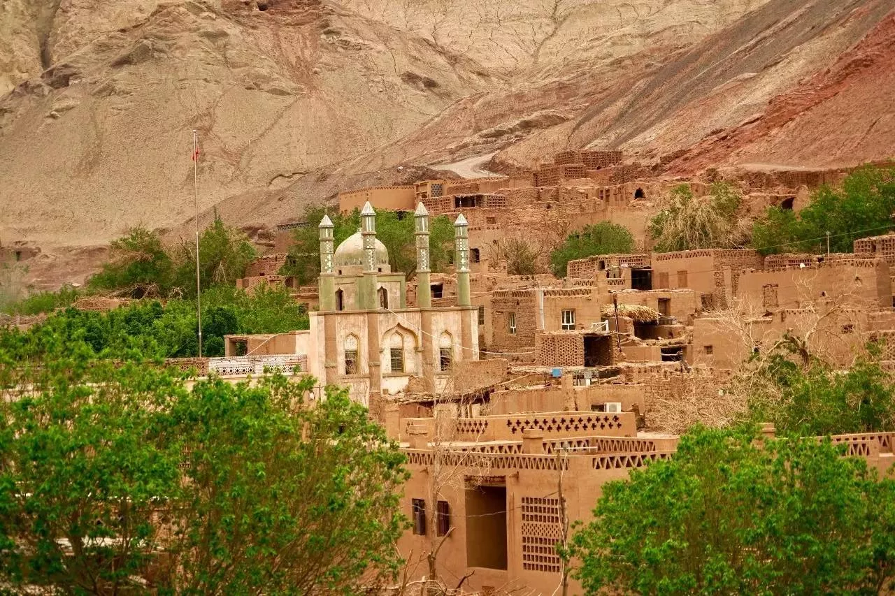 吐峪溝麻扎村位于吐魯番吐峪溝大峽谷南溝谷,是新疆古老的維吾爾族村落。它分布在綠塔聳立的清真大寺四周,約有百十戶人家。他們繼承了2000多年來的傳統(tǒng)建造房屋的習(xí)慣,均是以黃粘土制坯建成的窯房,經(jīng)濟(jì)實(shí)惠、? ?暖夏涼、造型美觀。進(jìn)入麻扎村,就進(jìn)入了土黃色的世界,路是土黃色的,房屋也是土黃色的,也正是滿眼的土黃色把黃、藍(lán)、綠三色相間的清真寺襯托得格外顯眼。