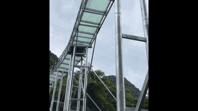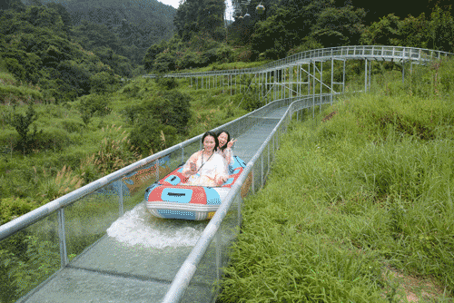 玻璃漂流采用高強(qiáng)度的雙層夾膠玻璃做為滑道主體,用優(yōu)質(zhì)不銹鋼支撐固定在墻壁巖石上,在保證安全的前提下,滑道隨著巖壁曲折蜿蜒,在水的驅(qū)動下,隨著皮筏不斷變換著高度和速度,全程尖叫不停。