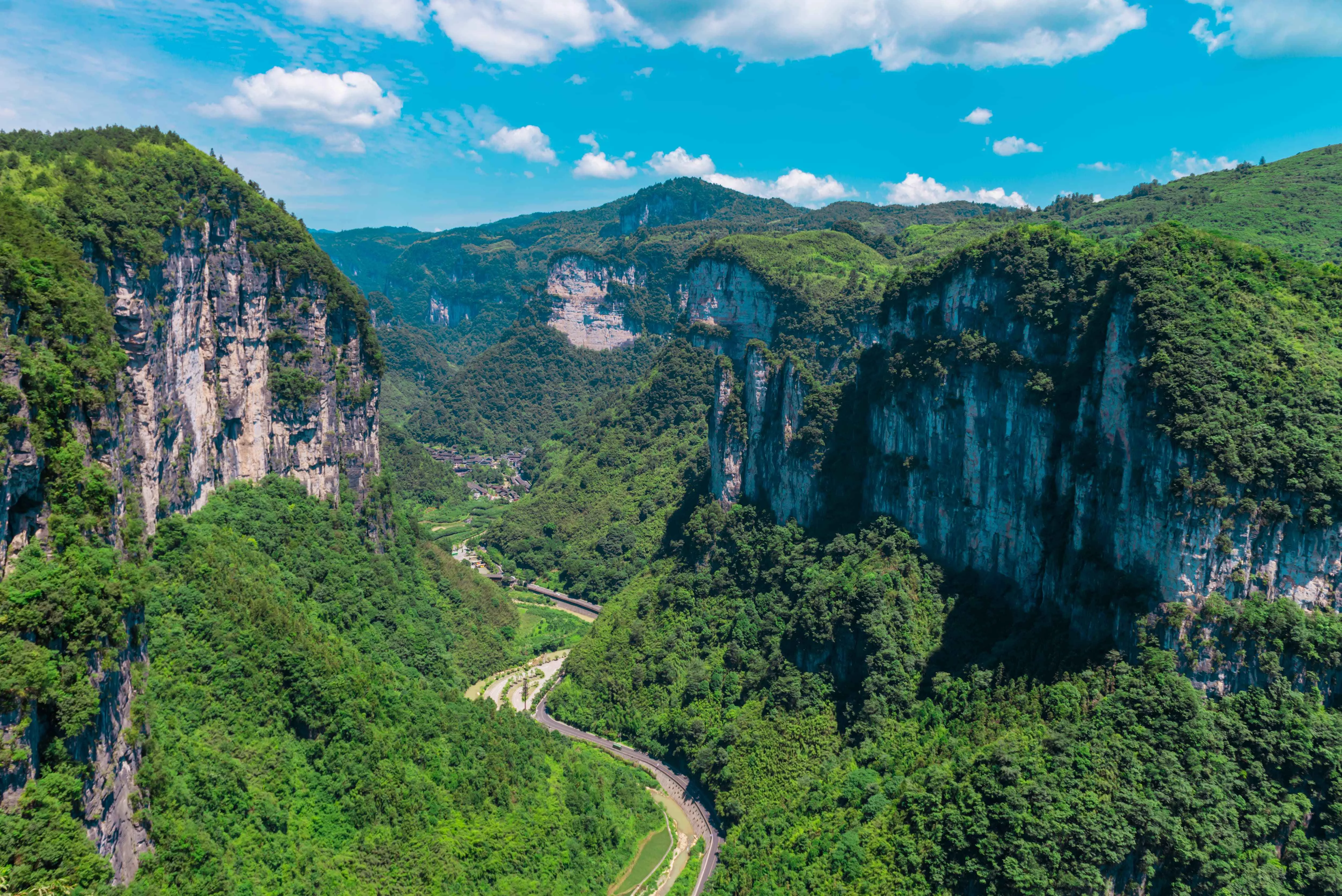 在棧道中段有一百米左右的玻璃棧道,踩在透明的玻璃地面上,谷底的景致看得清清楚楚,腳下空落落的,頗有種空中漫步的感覺,腳下就是傳說中的德夯大峽谷,在蜿蜒公路的盡頭,是藏在群山之中的德夯苗寨。若是實在害怕,那么可以走靠近山體的那一邊,有二三十厘米寬的木質(zhì)地面,瞬間安全感十足。