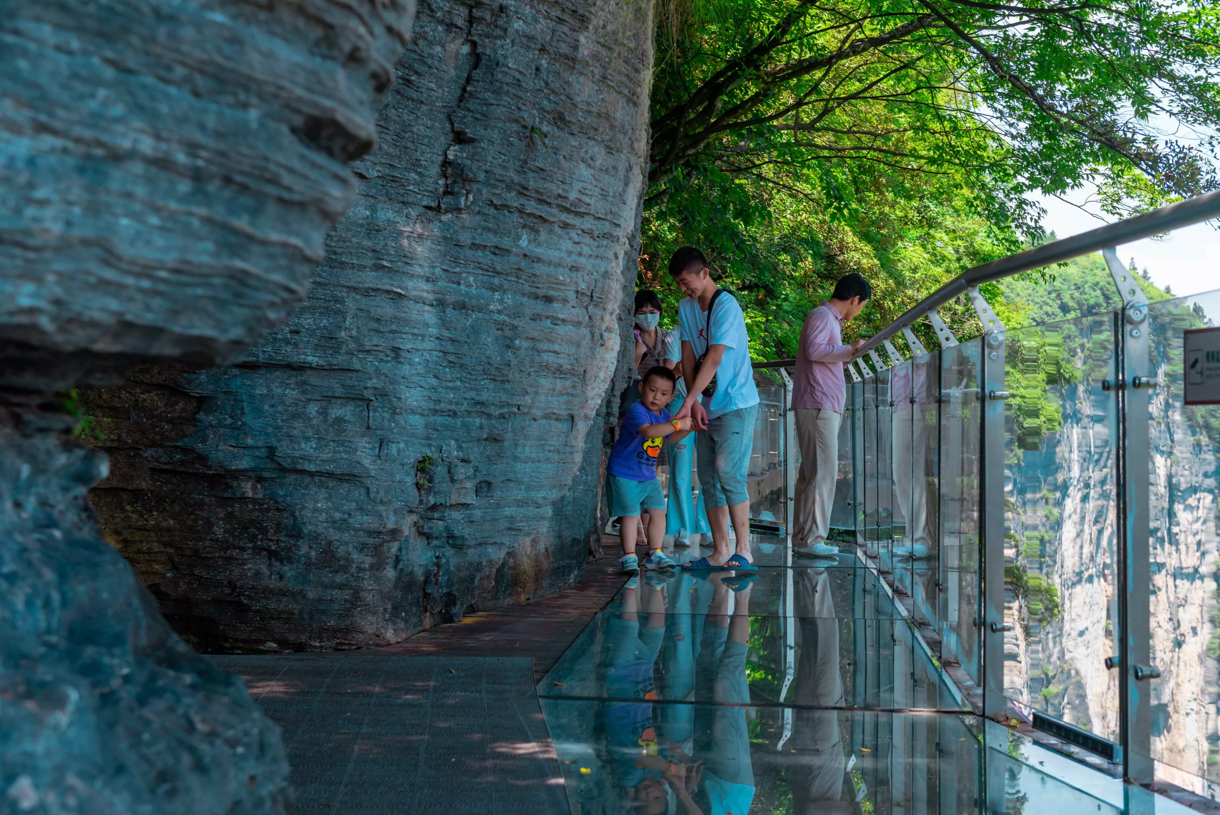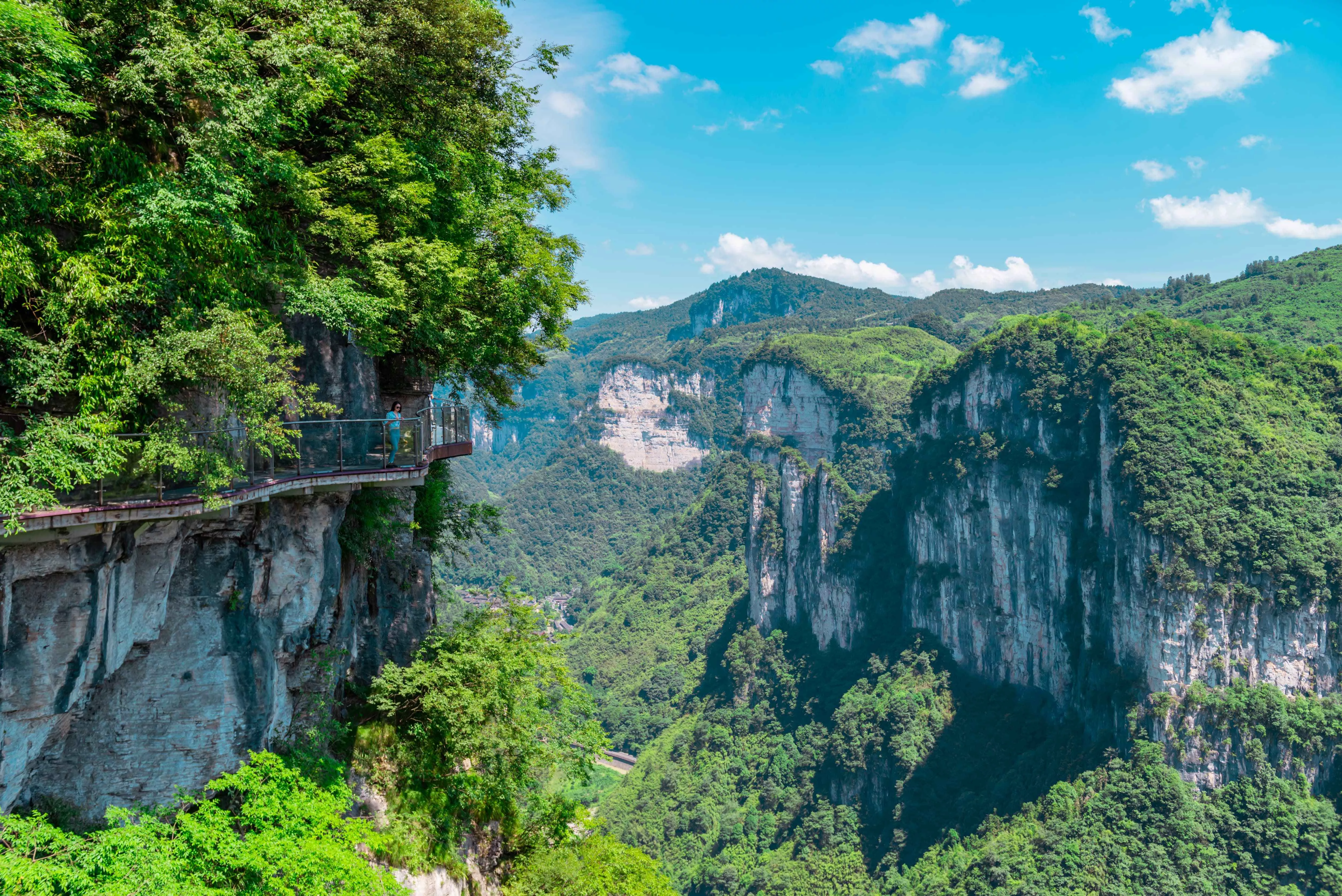 住在天橋仙居,可以選擇就近前往懸崖棧道游玩,棧道與似刀劈斧削的峽谷懸崖垂直,全長為1.6公里,與谷底落差300-400米,其中包括玻璃棧道、崖頂觀光平臺和慢步行道。剛進入棧道時是木質(zhì)慢道,掩映在綠樹叢中,看著遠處一望無際的藍天白云,感受著清風(fēng)拂面而過的涼爽,聞著空氣間散發(fā)著的草木氣息,整個人都處于一種十分放松的狀態(tài),并不可怕。