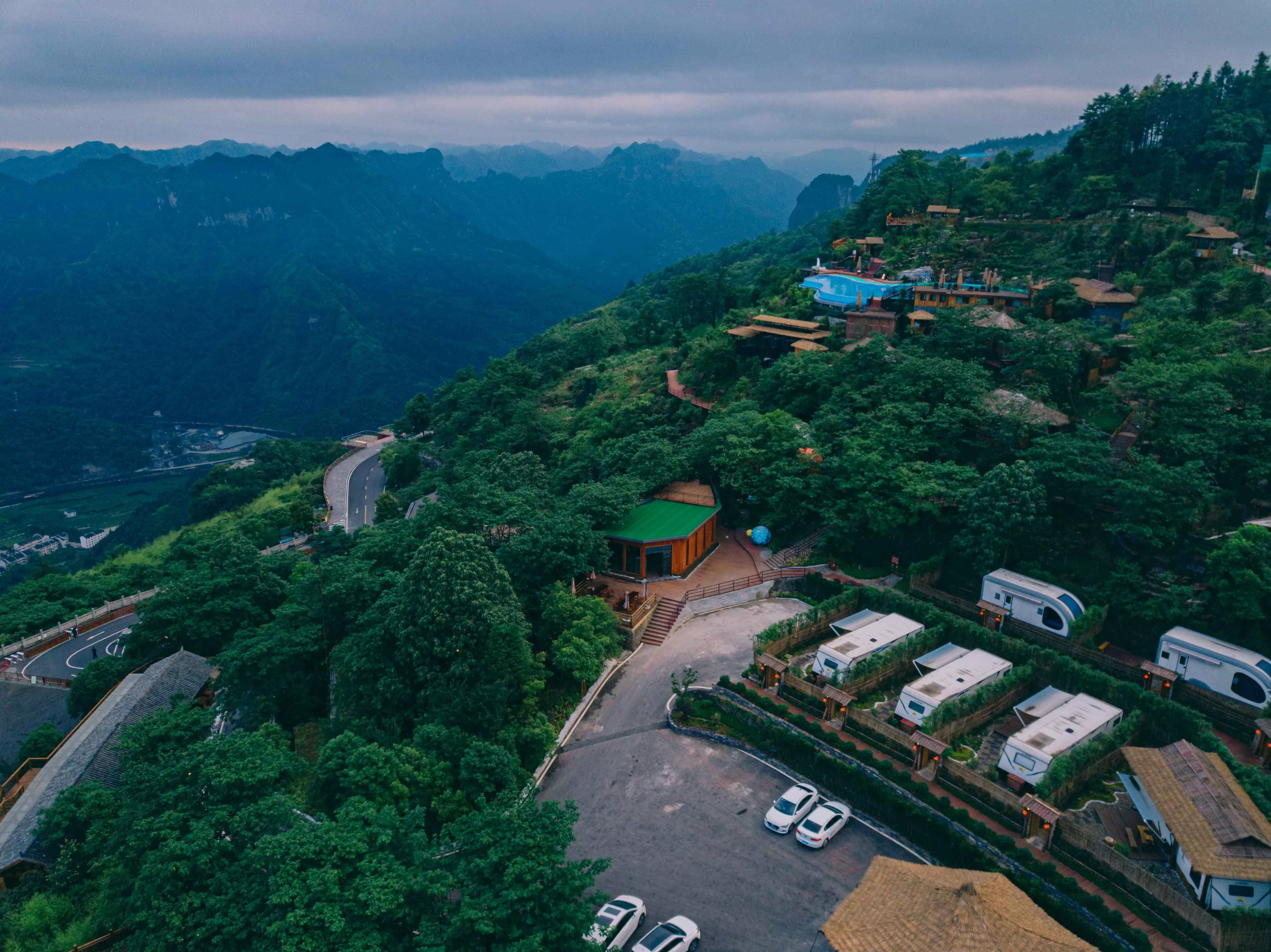 整個民宿依山而建,面朝峽谷,與鼎鼎大名的矮寨大橋相遙望。整個民宿面積不小,里面設(shè)有停車場、游泳池、茶廳、餐廳及客房,客房房型分為:木屋、全景玻璃房、家庭套房、帳篷以及房車