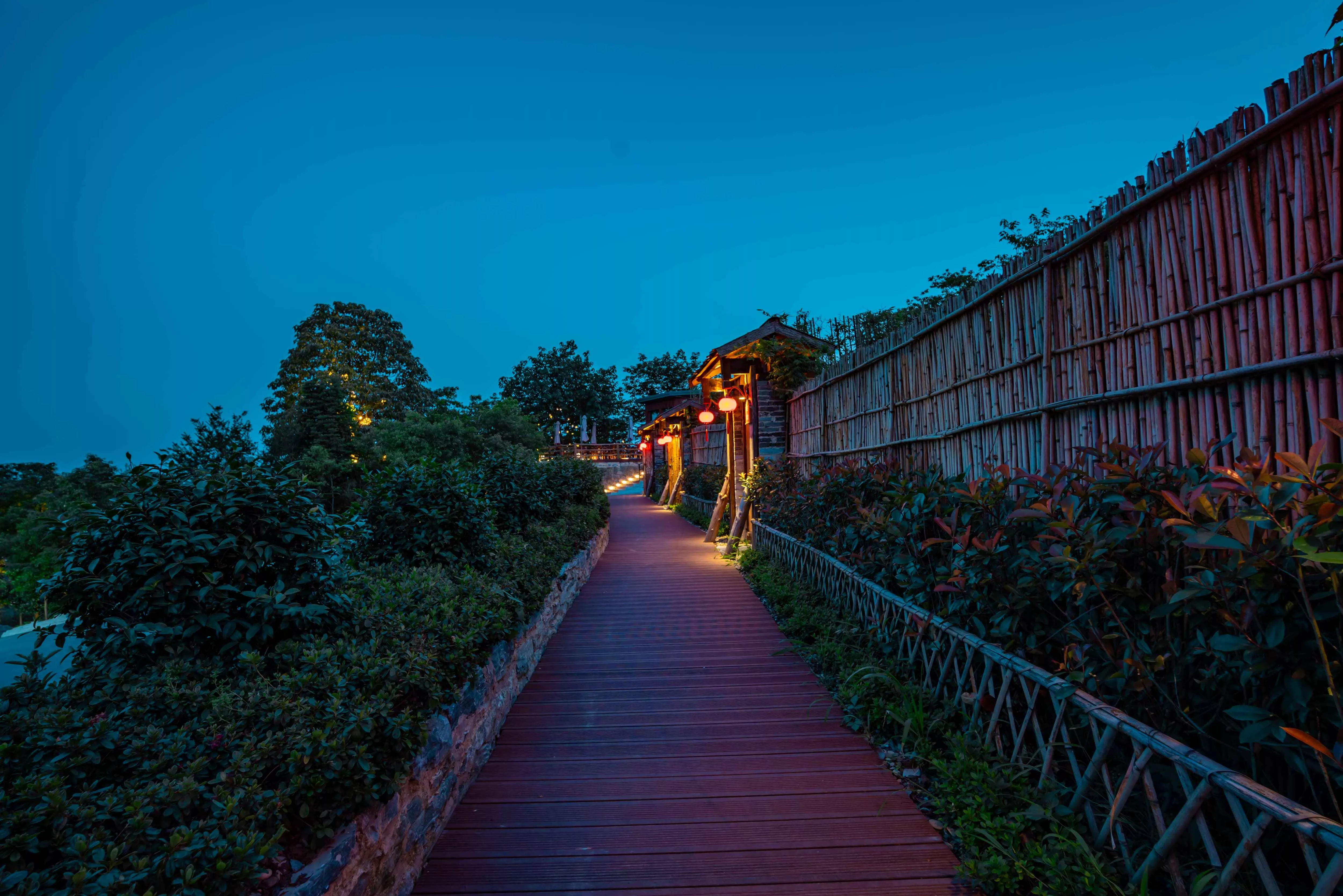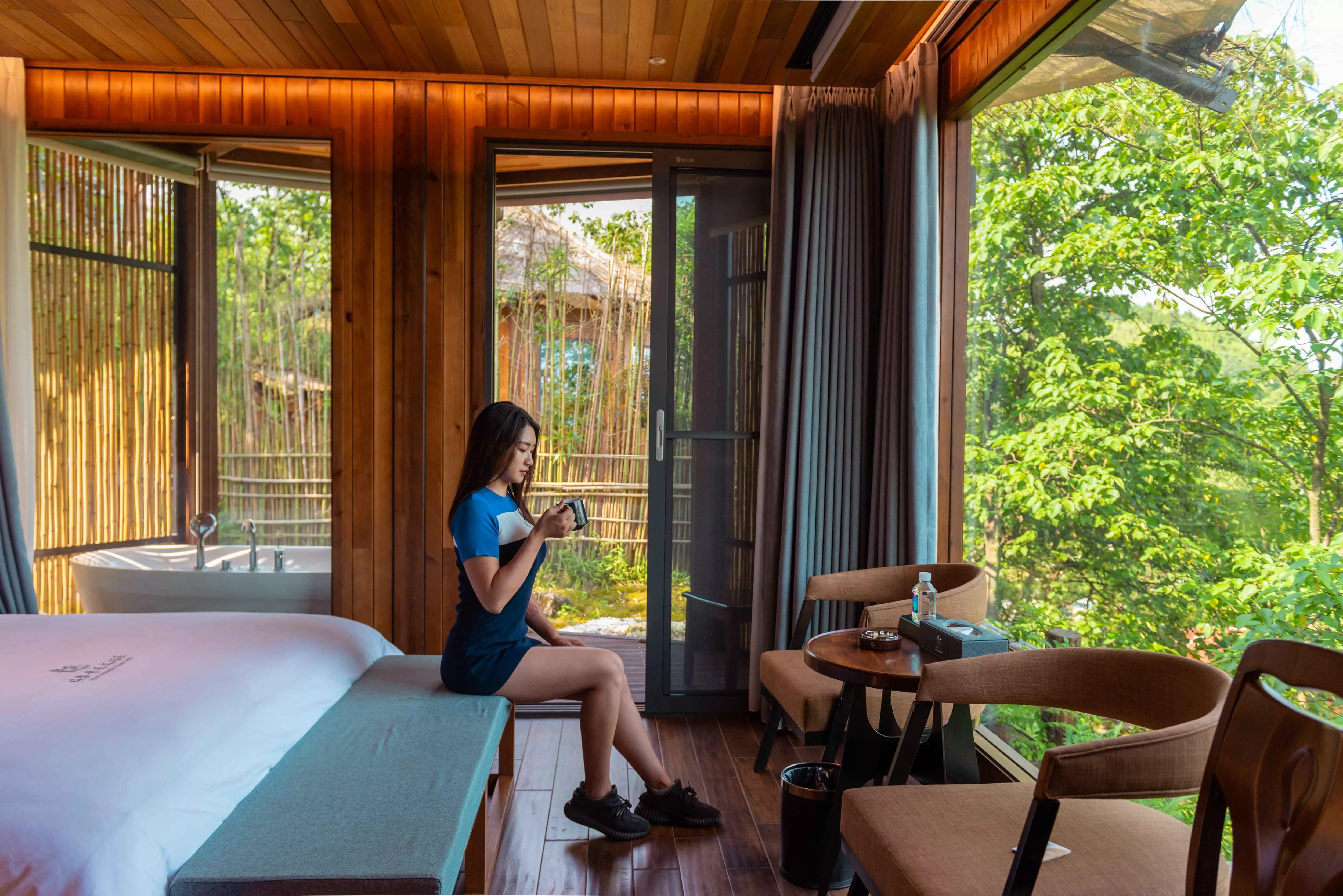 沿著棧道往上,可以到達房間。每一間屋子都有獨立的小院子,竹籬笆或矮灌木柵欄隔開了路人的視線,充分保障了獨立空間私密性。推開輕奢木屋小院子的木門,一座精巧的小木屋出現(xiàn)在眼前,進得門來,才發(fā)現(xiàn)看起來小巧的木屋其實不小,里面配備了茶室,機麻,投影儀和浴缸,很贊哦!