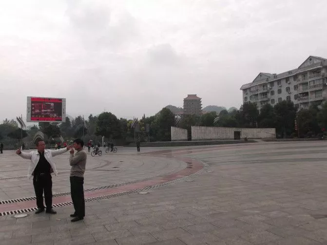 廣場是縣城的中心,雖然不很大,但改造得不錯,有一些雕飾、綠化小品點綴。周圍林立著五六層的居民樓,遠處有一座高高的樓閣,不知是什么。有少年在騎車,老人坐在花圃邊,兩個游人在拍照,安靜干凈,要不是趕去德夯,我一定要好好地在這里轉(zhuǎn)轉(zhuǎn)。