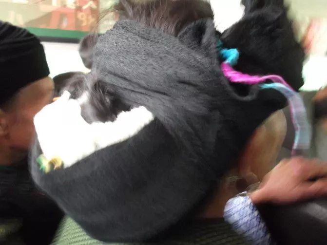 不過,我的注意力很快被旁邊坐著的兩個女人吸引去了。這是兩個五十來歲的女人,她們穿著的苗家服飾讓我眼睛一亮。寬襟大袖的花褂子游蕩在瘦小的身軀上,頭上裹著黑色的絲帕,絲帕的后邊塞有白色的織物,而前面有兩根紅綠相間的織帶,不知有什么寓意,其中一個帶有銀制的龍頭耳環(huán)。這樣的裝束并不亮麗,更不能和電影電視上的相比,卻是我們此次湘西行第二次見到的,而且又是近距離坐在我旁邊,我悄悄用相機記錄下這一刻。