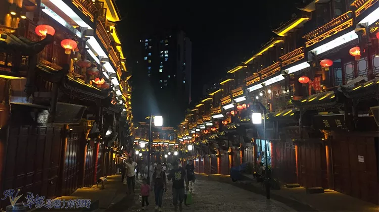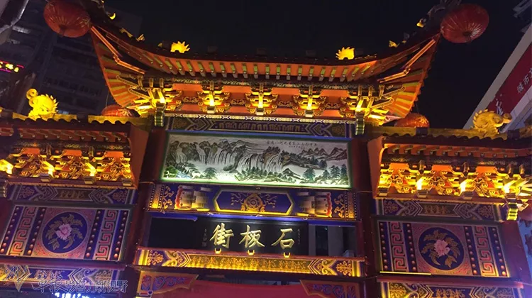 石板街的夜景,整條街道古樸典雅,金碧輝煌