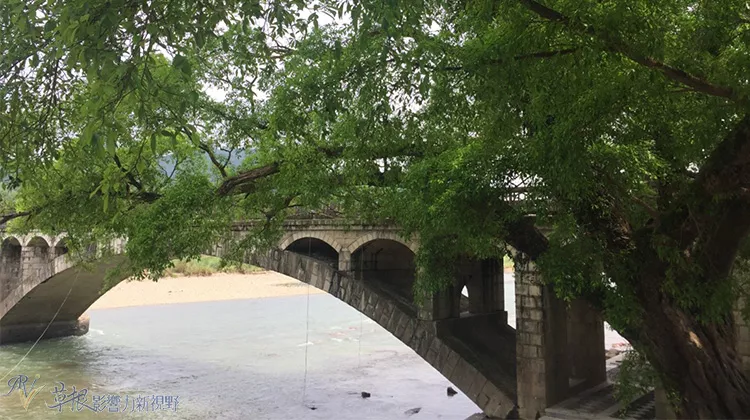 榕樹旁有條石拱橋橫過江面