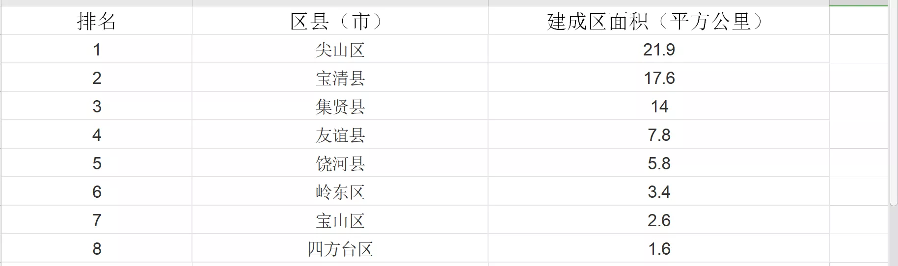 雙鴨山市建成區(qū)面積排名表