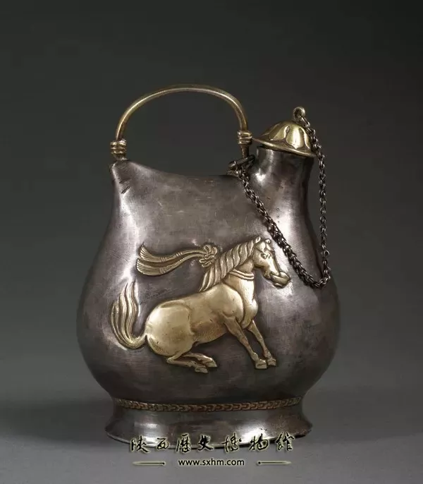 壺的造型采用的是我國北方游牧民族皮囊的形狀,壺身為扁圓形,一端開有豎筒狀的小口,上面置有覆蓮瓣式的壺蓋,壺頂有銀鏈和弓形的壺柄相連。這種形制,既便于外出騎獵攜帶,又便于日常生活使用。銀壺的兩側(cè)采用凸紋工藝各塑造出,一匹奮首鼓尾、躍然起舞的駿馬,表現(xiàn)了唐代工匠在設(shè)計(jì)上的獨(dú)具匠心。