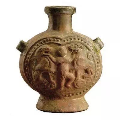 它是絲路商人的出行良器,唐代文物。在穿越遼闊沙漠之時(shí),扁壺中裝的是生命之泉,在滿載而歸之時(shí),扁壺中裝的則是相慶之酒。
