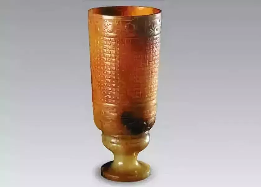 該杯于1976年陜西省西安市東張村,秦阿房宮遺址出土。杯原來是青玉材質(zhì),因埋在地下受沁,現(xiàn)在呈焦黃色。專家評(píng)價(jià)此杯器形規(guī)整、雕琢精細(xì),氣派莊重,是秦代玉器中的精品。
